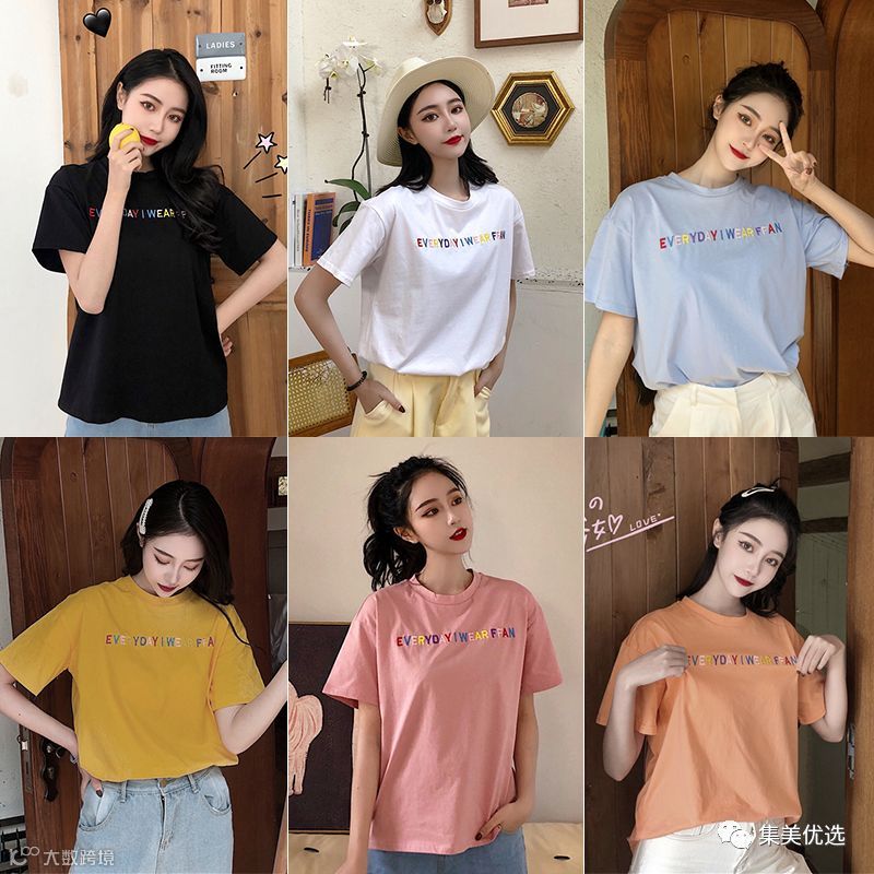 7色纯棉网红同款彩色字母刺绣百搭T恤