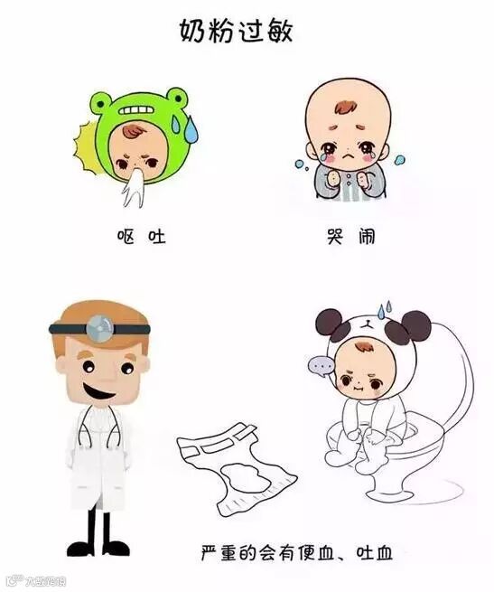 奶粉过敏的宝宝会呕吐、哭闹、腹泻、严重的会便血和吐血。