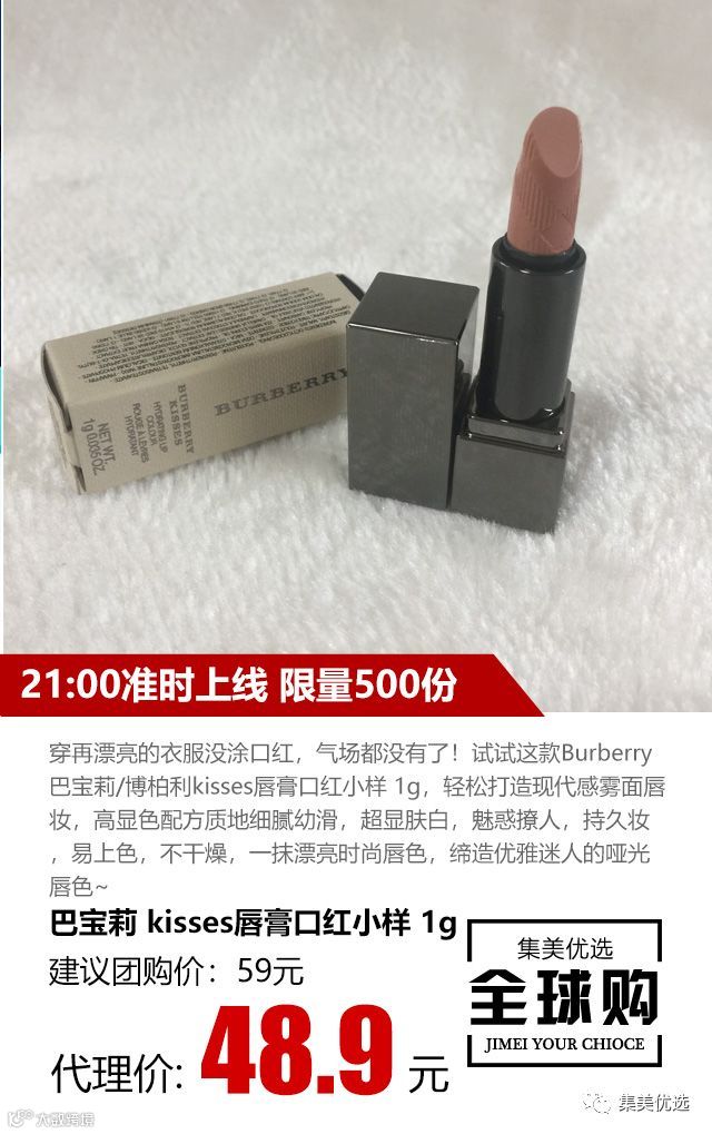 穿再漂亮的衣服没涂口红,气场都没有了!试试这款Burberry巴宝莉/博柏利kisses唇膏口红小样1g,轻松打造现代感雾面唇妆,高显色配方质地细腻幼滑,超显肤白,魅惑撩人,持久妆,易上色,不干燥,一抹漂亮时尚唇色,缔造优雅迷人的哑光唇色~