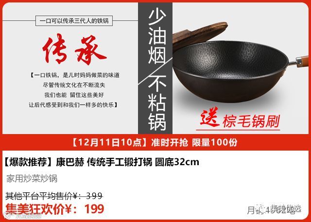 康巴赫老铁锅章丘传统手工锻打锅32cm 送棕毛锅刷