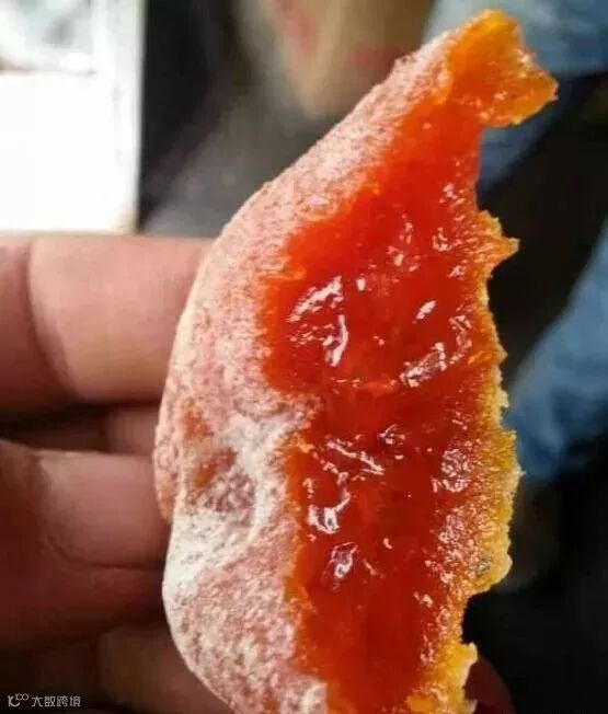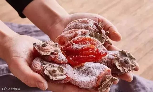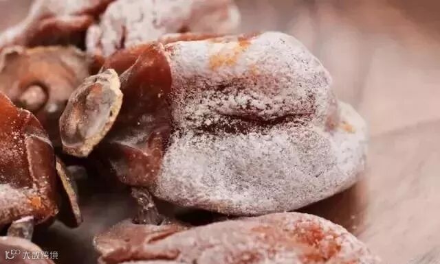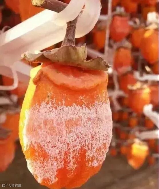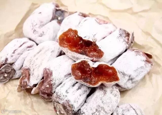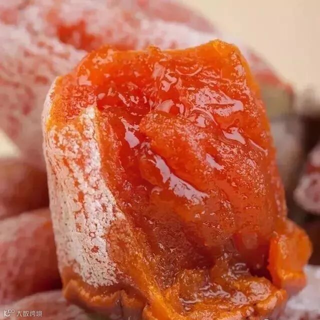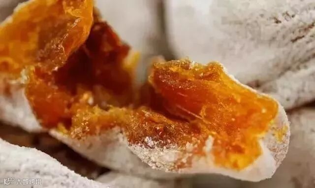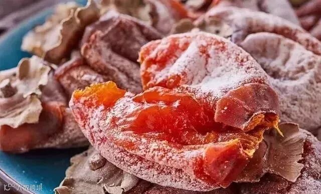 柿饼在晾晒过程中,自然析出葡萄糖和果糖形成白霜,即“柿霜”,是一味珍贵中药,具有润肺生津的功效,内部的粘糯碰到外部的甘爽,使得柿饼吃起来口感十分独特。
