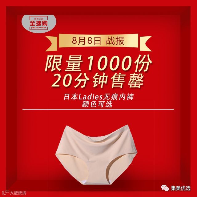 13点档的日本Ladies无痕内裤 1000条,20分钟就宣告售罄,好评反馈99.9%的内裤一上架,就遭到小伙伴们疯抢,好多都是好几条一起下单,实在是要为这几位疯狂点赞,这么优惠的价格,抢这么多,太明智了!