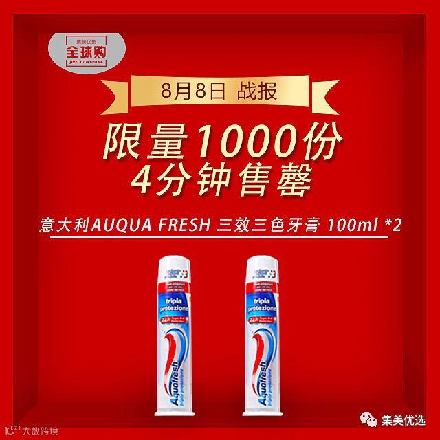 9点上架的意大利三色牙膏,1000组,一上架就遭到疯抢,4分钟就华丽售罄,这速度实在是惊人!首先恭喜这些抢到的小伙伴们,简直是家庭好帮手,这么美丽的价格,省下来一大笔钱,没有抢到的小伙伴只能说抱歉了,错过了这么让人感动到哭的价格,实在是亏大发了。第一次买贵不是你的过错,第二次还买贵绝对是一种罪过,第三次再买贵那就是一种耻辱!