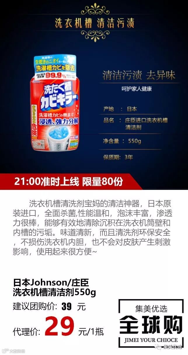 洗衣机槽清洗剂宝妈的清洁神器,日本原装进口,全面杀菌,性能温和,泡沫丰富,渗透力很棒,能够有效地清除沉积在洗衣机筒壁和内槽的污垢。味道清新,而且清洗剂环保安全,不损伤洗衣机内胆,也不会对皮肤产生刺激影响,使用起来很方便~