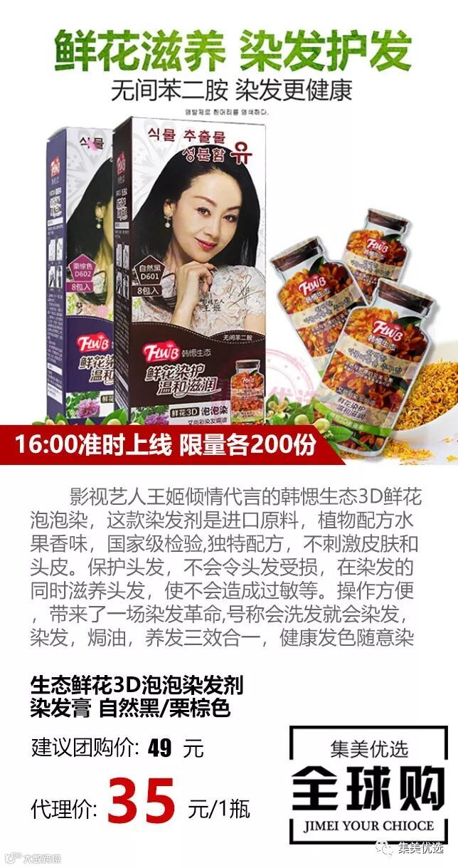 影视艺人王姬倾情代言的生态3D鲜花泡泡染,这款染发剂是进口原料,植物配方水果香味,国家级检验,独特配方,不刺激皮肤和头皮。保护头发,不会令头发受损,在染发的同时滋养头发,使不会造成过敏等。操作方便,带来了一场染发革命,号称会洗发就会染发,染发,焗油,养发三效合一,健康发色随意染~