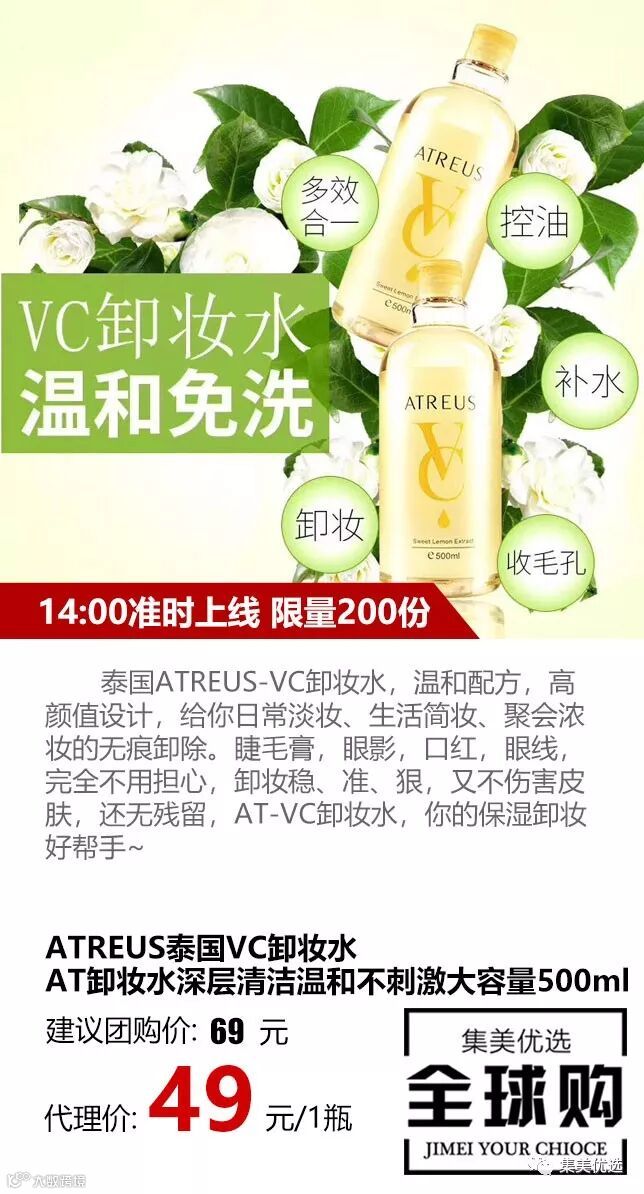泰国ATREUS-VC卸妆水,温和配方,高颜值设计,给你日常淡妆、生活简妆、聚会浓妆的无痕卸除。睫毛膏,眼影,口红,眼线,完全不用担心,卸妆稳、准、狠,又不伤害皮肤,还无残留,AT-VC卸妆水,你的保湿卸妆好帮手~