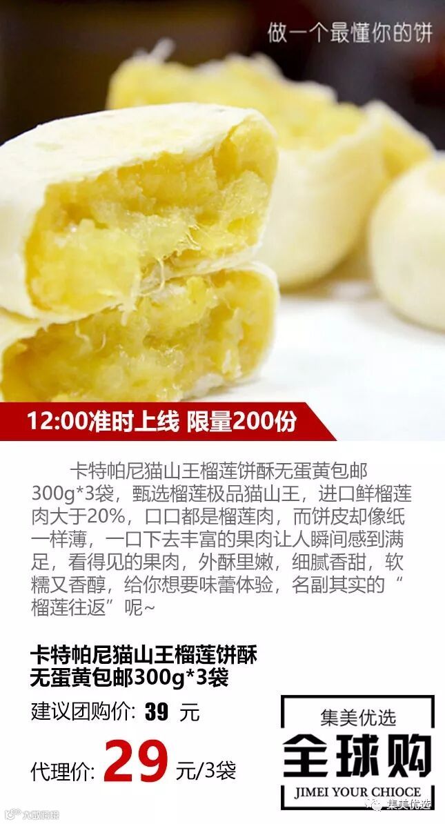 卡特帕尼猫山王榴莲饼酥无蛋黄包邮300g*3袋,甄选榴莲极品猫山王,进口鲜榴莲肉大于20%,口口都是榴莲肉,而饼皮却像纸一样薄,一口下去丰富的果肉让人瞬间感到满足,看得见的果肉,外酥里嫩,细腻香甜,软糯又香醇,给你想要味蕾体验,名副其实的“榴莲往返”呢~