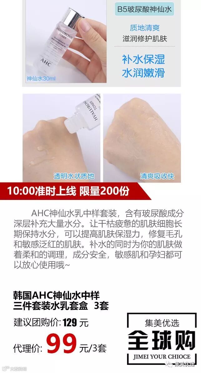 AHC神仙水乳中样套装,含有玻尿酸成分深层补充大量水分。让干枯疲惫的肌肤细胞长期保持水分,可以提高肌肤保湿力,修复毛孔和敏感泛红的肌肤。补水的同时为你的肌肤做着柔和的调理,成分安全,敏感肌和孕妇都可以放心使用哦~