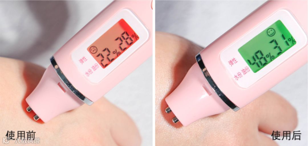 来看一下使用前后肌肤的含水量变化,可以清楚的看到从22%上升到了48%。