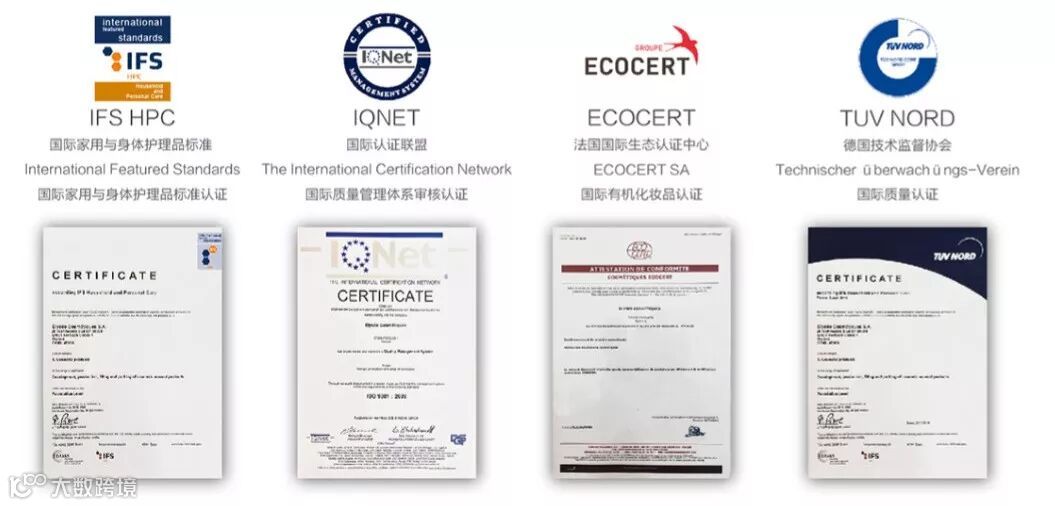 所有产品均通过欧盟权威质量体系认证机构的认可,包括IFS HPC(国际家用与身体护理标准认证)、IQNET(国际质量管理体系)、ECOCERT(国家有机化妆品认证)、TUV NORD(德国技术监督协会)