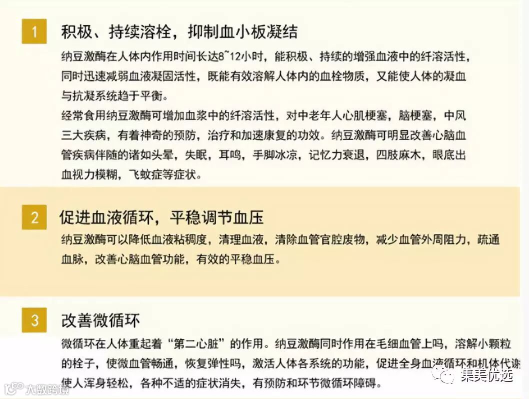 纳豆是日本人餐桌的长寿食物,其中含有的纳豆激酶具有掀桌溶血栓功效,是养生首选,日研所纳豆激酶超浓缩软胶囊90粒,天然纳豆激酶可以清除血液中不正常的血块就是中风、心肌梗塞、酸麻、老年痴呆的原凶——血栓。纳豆激酶酵可以有效抑制低密度胆固醇(LDL)被氧化,能够降低总胆固醇及三酸甘油脂的浓度,减少动脉硬化的发生。被世界各国称为血管的清道夫。还可以对视网膜病变和细小血管增生有预防作用。预防白内障,青光眼等,改善飞蚊症。