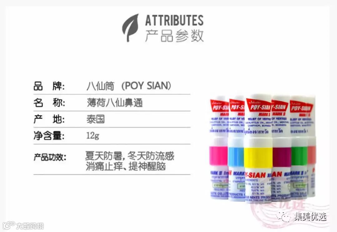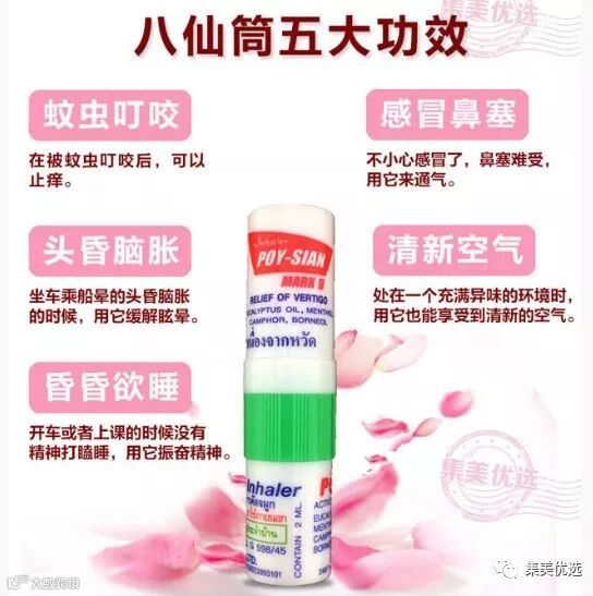 一头是鼻吸,一头是药油,可以点在太阳穴,一支两用。鼻子敏感不通气,可将鼻通的一边放入鼻中嗅一嗅就行了。头痛,头晕,晕车,瞌睡没精神时可将八仙筒的一边放入鼻中嗅一嗅再把另一边在太阳穴上轻 轻点一点,再轻轻的按摩太阳穴。被蚊虫叮咬,把鼻通的油这边擦在伤口上。