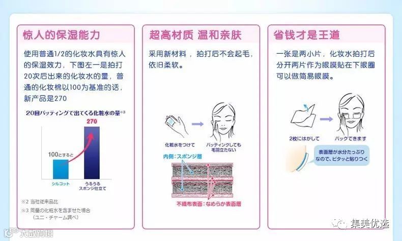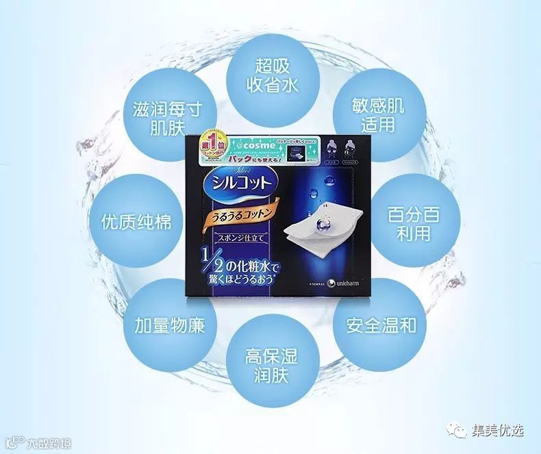 日本COSME大赏化妆棉类第一!最好用的化妆棉!只要用1/2的爽肤水就令人惊奇的化妆棉布。日本连续10年销售量NO.1,尤妮佳不留棉絮的化妆棉 ,采用天然棉成份,经高温消毒,特许制法不含各种荧光剂和添加料。 特别有效的贴近肌肤,彻底卸除面膜及妆容,质地格外柔韧顺滑,用后不留残屑。