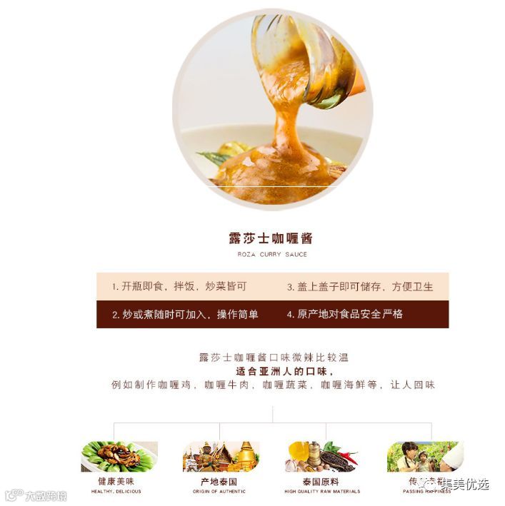 泰国露莎士咖喱酱,来自于泰国的正宗美味酱料。精选优质的香料为原料,保证酱料的口味。采用先进的全自动生产机器,并且严格规范生产流程,安全的生产车间,四季恒温仓库保证产品新鲜度,及时生产及时发货。