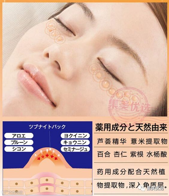 它针对眼睛的周围以及身体其他部位的白色脂肪粒,尤其是由于角质层堆积造成的白色脂肪粒。 这些颗粒因为和人体自代谢异常有关,或者是因为皮肤的干燥等皮肤问题引起的,本产品含让让脂肪粒和皮肤脱落的パチルス发酵液和水杨酸成分,添加了杏仁抽出物,玻尿酸和胶原蛋白集中护理,让脱落的脂肪粒部位不会有很明显的皮肤问题。