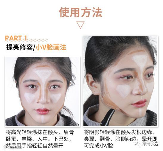 使用方法: 1.高光,画在额头中心,眉骨,眼下,颧骨,鼻骨,鼻下,下巴。