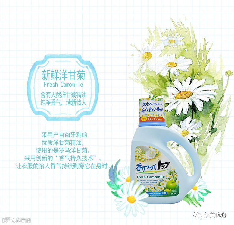 狮王不用多说,日本有名的日化品牌。东西齐全、好用又不贵。这款日本进口狮王洋甘菊味洗衣液,超浓缩+超洁净+持久留香+超柔顺,多效合一,蕴含天然植物成分、不添加荧光剂,温和无刺激。快速去污,用量省、效果快,洗完衣物柔软并伴有淡淡的清香,留香时间也特别长,省钱又省事,味道还好闻。并荣获2012年日经优秀产品、服务奖优秀奖。