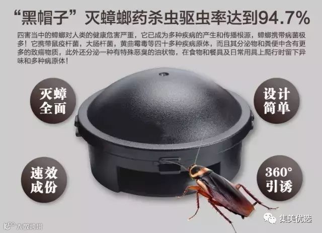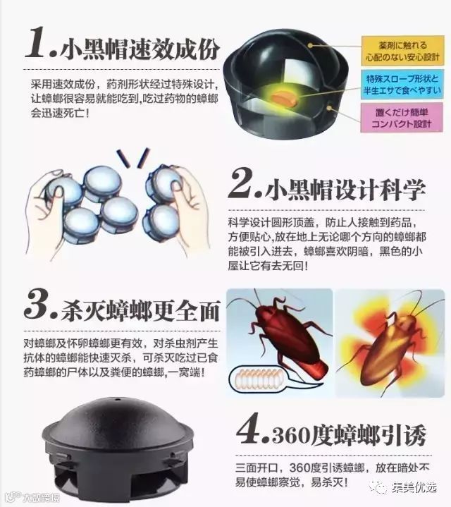 日本本土非常热销的,几乎所有家庭都在使用,效果显著 一个小黑帽里有一颗蟑螂引诱剂,打开后有一点焦糖味,能吸引蟑螂。 7大特色,高效杀灭蟑螂,连锁效应,从根本上解决蟑螂问题 安全性高,药物放在小帽子里,不再担心人、宠物会触及药。