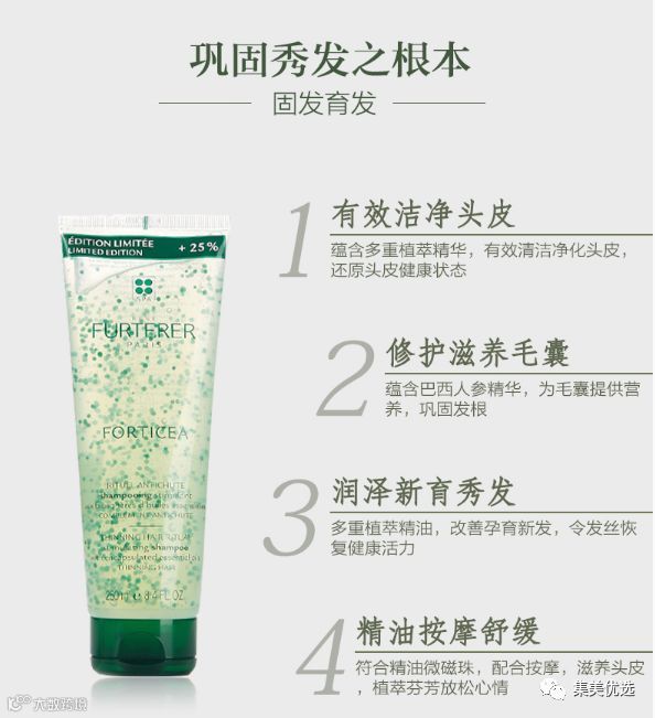 隶属法国第一药厂皮尔法伯集团,属于大集团的一款正规军,现在已经正式进军国内。Furterer的整体配方都是无硅配方,走植物路线。这款添加了精油成分。清洁力中等偏上。主打的防脱主要是配合天然胶体类成分来柔顺抗静电,另外就是减少了阳离子聚合物的使用。