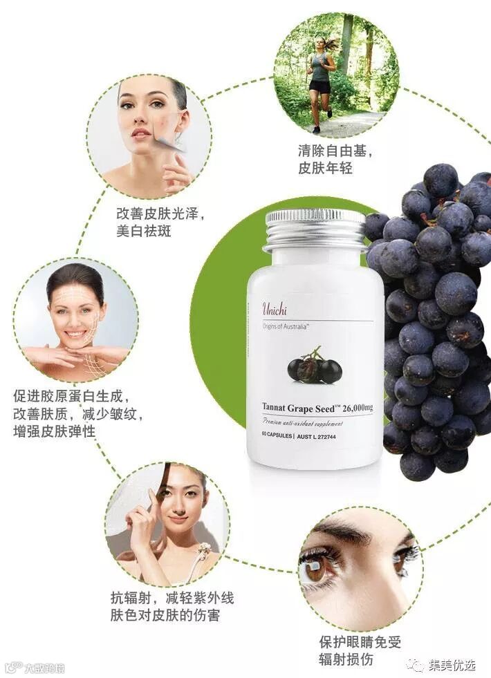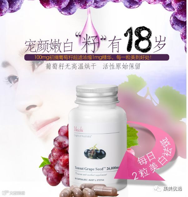 澳洲Unichi丹拿黑贵妇葡萄籽精华,丹拿葡萄籽有高于普通葡萄籽4-5倍的原花青素(OPC),有效防护人体免受自由基侵袭,保持血管和眼睛的健康。强抗氧化,抗衰老,改善肤质,去除细纹。