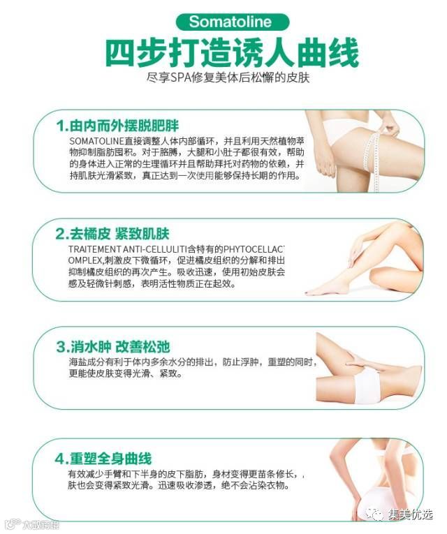 特有的PhytoUltraslim-complex (提取于天然海盐,褐藻和乳木果油) 和亚马逊白色粘土,在晚间作用于脂肪细胞,促进脂肪的分解;海盐成分有利于体内多余水分的排出,防止浮肿。Somatoline利用夜间皮肤特别敏感的特点,随着按摩,有助于对抗皮肤下脂肪堆积,促进多余的体液生理排水。瘦身的同时,皮肤会变得光滑、紧致。
