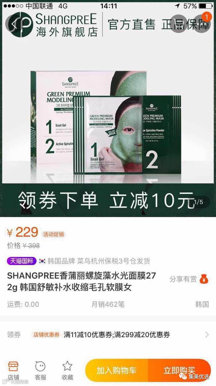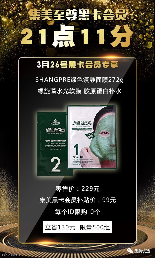 3月26日,21:11,在集美黑卡会员专区,只需要99元就可以买到正品韩国SHANGPREE专柜香蒲丽面膜螺旋藻绿色水光软膜补水保湿*1盒(1号/5片,2号/5片),立省130元,限量500份,手慢无!!!