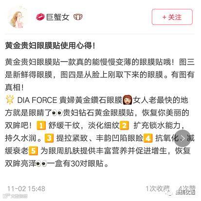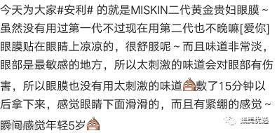 这款贵妇黄金眼膜了,是韩国目前为止堪称最好用的眼膜,没有之一 。要说她的成分那绝对是高大上了,黄金和胶原蛋白(*@ο@*) 哇~她主要的功效就是针对抗皱,补水,去细纹,缓解眼袋,但是她不光可以修复眼周的细纹,抬头纹,法令纹也是妥妥的哦~\(≧▽≦)/~要提醒大家一下眼部是独立的皮脂结构,眼周的肌肤其他部位的皮肤要薄很多,而且我们每天都面对的电脑,电视机,眼周很容易干燥,所以我们需要用眼部专用的产品来做眼部的护理哦,对症下药才可以事半功倍哦 。
