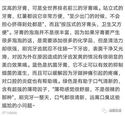 口碑效果不用多言,是一款超级好用的一款牙膏哦!牙膏细腻,泡沫少,不会因为泡沫多而干呕,不辣口不呛,但是刷完牙齿口气清新,完全满足肉肉对牙膏的要求~站立式牙膏独特的按压设计,始终保持管内真空,抗氧化,能把所有牙膏都按出来,完全不浪费~含氟,含AHP,防蛀的同时修补牙齿细微缺损,木糖醇等形成隔离膜保护牙齿。能深层清洁牙齿缝隙,彻底杀菌,去除口气。