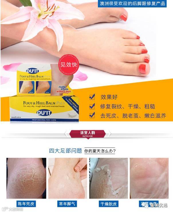 冬季必备,澳洲DU'IT急救脚膜脚霜,5天见效。尤其针对脚后跟干裂脱皮。本产品能迅速深入渗透皮肤内层,改善乾燥龟裂现象,令肌肤时刻保持柔软丶富弹性,更同时有效去除粗糙的死皮而无需使用砂石磨除,为肌肤提供一层有效的保护膜,防止皮肤内层的水份和油脂流失。连续使用5天效果就杠杠的。