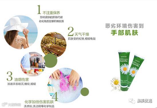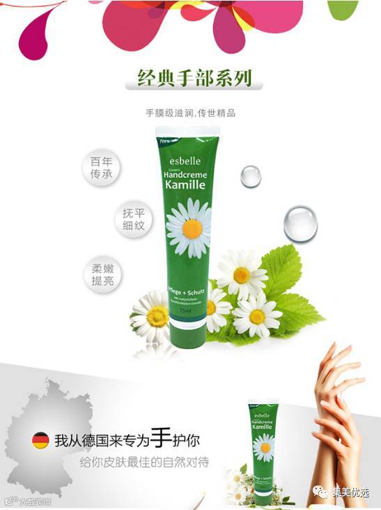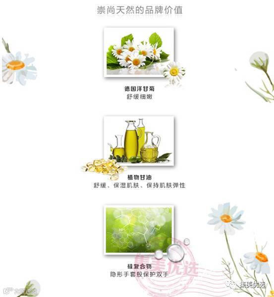 1. 崇尚天然的品牌价值 只挑选最高品质的天然有机植萃,德国洋甘菊:舒缓细嫩。植物甘油:舒缓、保湿肌肤、保持肌肤弹性。硅复合物:隐形手套般保护双手