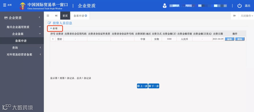进入“投资人员信息”填写,首先点击“新增”