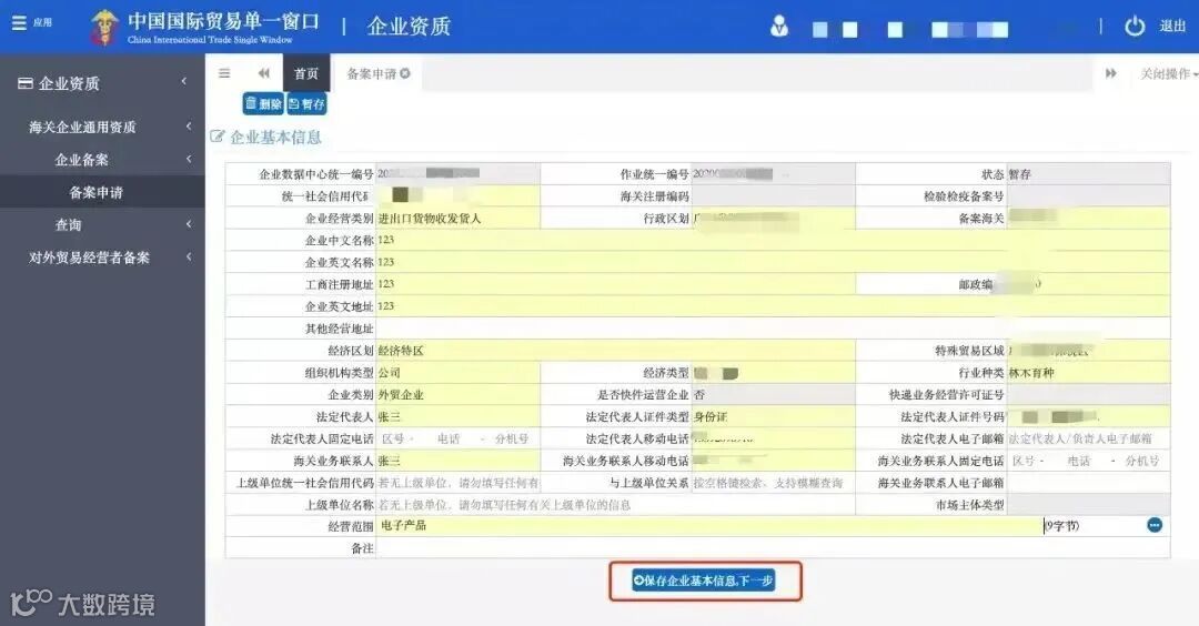 企业基本信息录入完成后,点击“保存企业基本信息,下一步”。