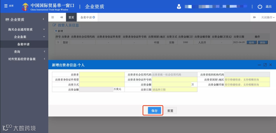 选择“投资人员类型后”,对“出资者信息”填写,填写完毕后点击“保存”,再点击“下一步”。