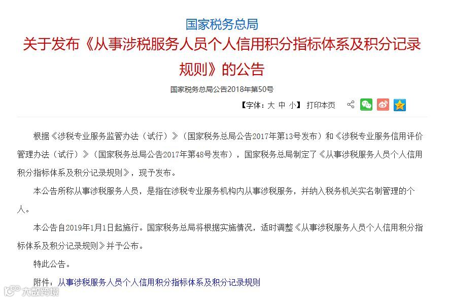 关于发布《从事涉税服务人员个人信用积分指标体系及积分记录规则》的公告