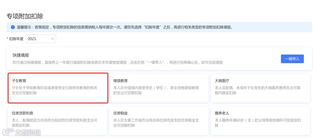 比如2021年新增子女教育扣除,需要申报填写。