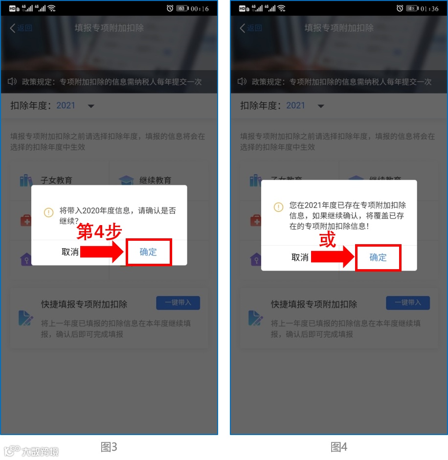 ② 依据提示“将带入2020年度信息,请确认是否继续?”或者“您在2021年度已存在专项附加扣除信息,如果继续确认,将覆盖已存在的专项附加扣除信息!”,确认后点击“确定”;如下图3、图4: