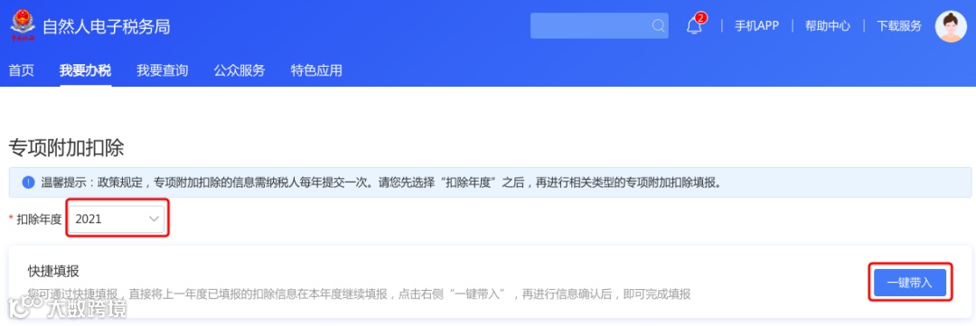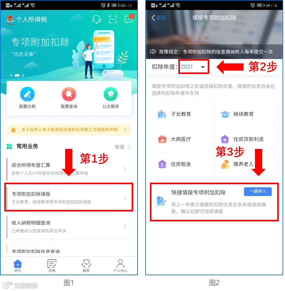 ① 打开个人所得税APP-首页-“专项附加扣除填报”-选择“扣除年度”——“一键带入”;如下图1、图2:
