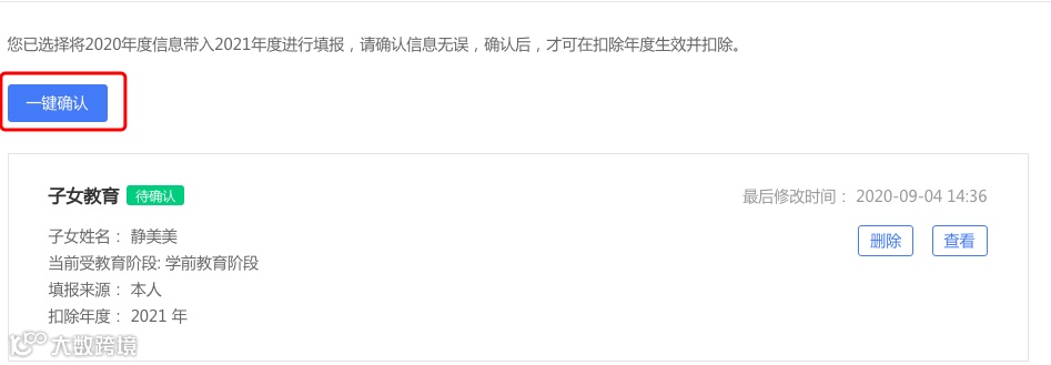③ 打开“待确认”状态的专项附加扣除,核对信息;如有修改,可以点击“修改”,信息确认后点击“一键确认”。如下图5、图6: