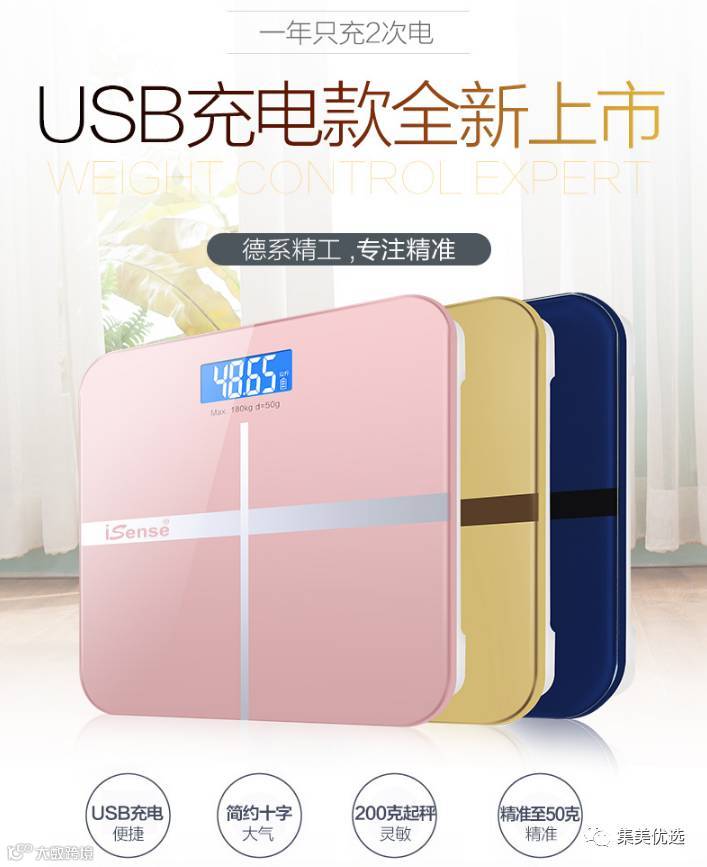 iSense家用可充电电子秤体重秤健康人体秤(玫瑰金、宝石蓝、土豪金)