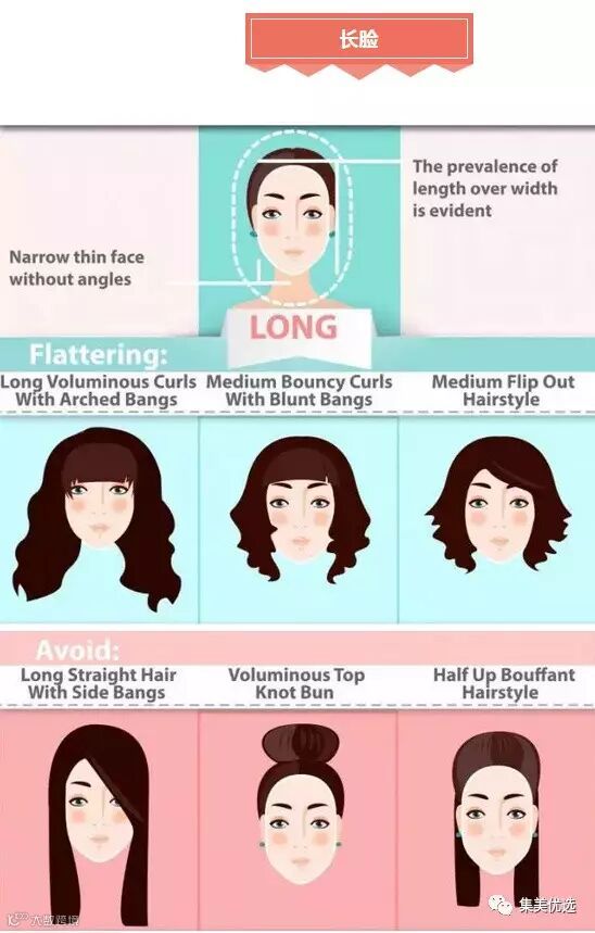 长脸型不适合与头皮太贴合或者是挽在耳后的发型,选择有点蓬松感和有刘海的发型可以打造出鹅蛋脸的最佳效果。