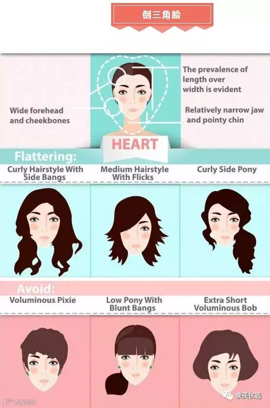 倒三角脸型是除了鹅蛋脸最好搭配发型的,但由于下巴比较尖,额头又相对宽大,所以不适合露出全脸,选择偏分的刘海就可以减小额头的宽度,看上去会协调很多。