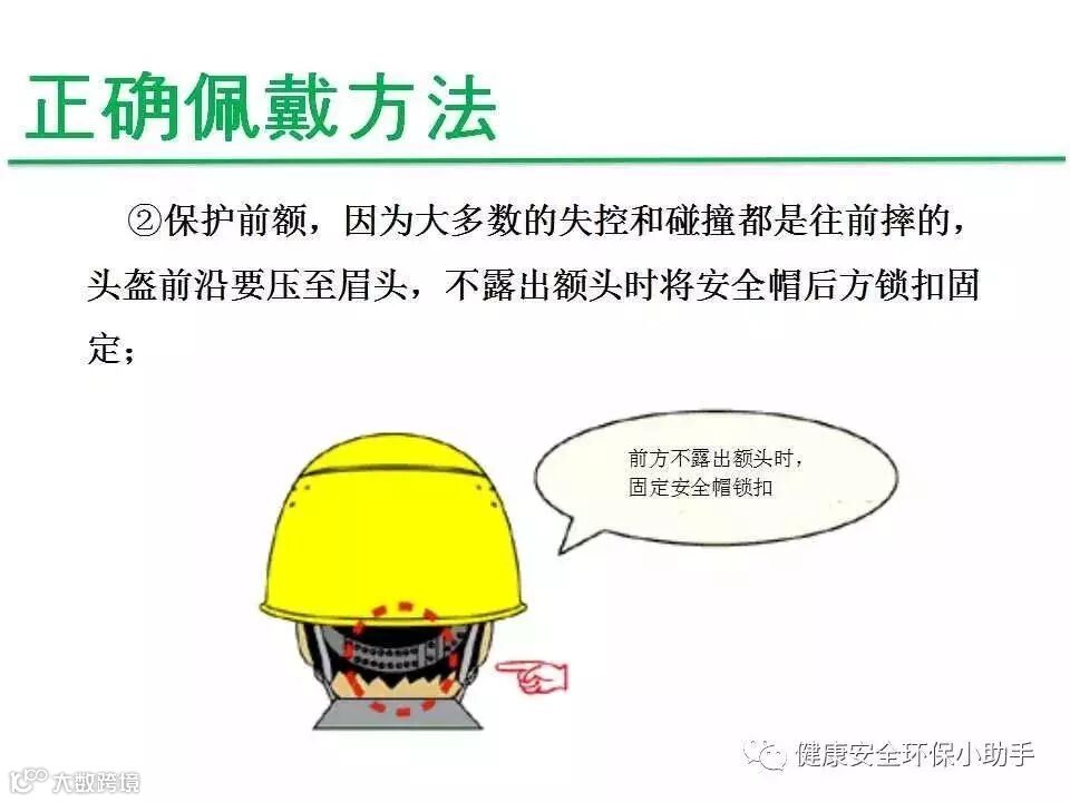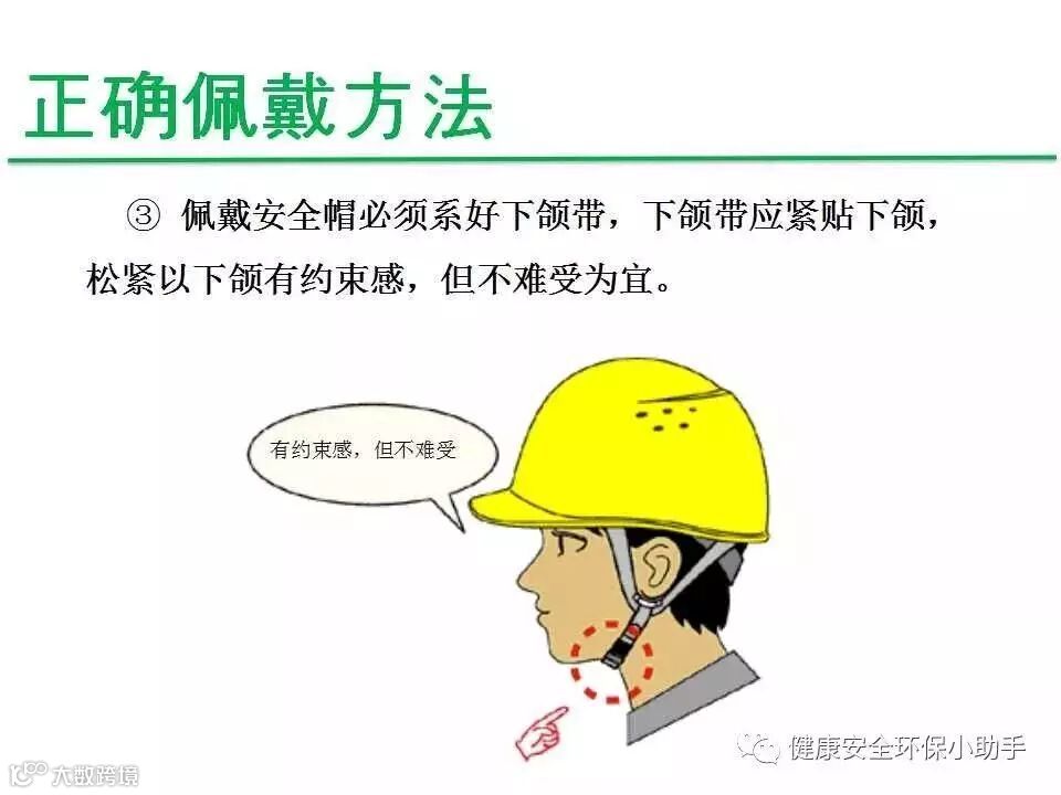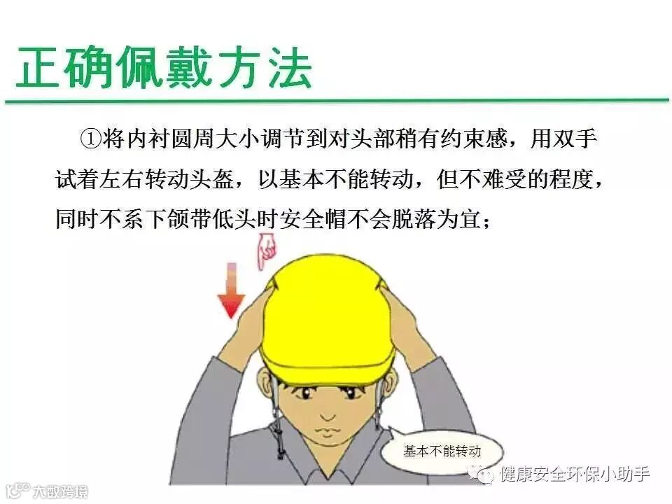 1、选用与自己头型合适的安全帽,帽衬顶端与帽壳内顶必须保持20-50mm的空间,形成一个能量吸收缓冲系统,将冲击力分布在头盖骨的整个面积上,减轻对头部的伤害。