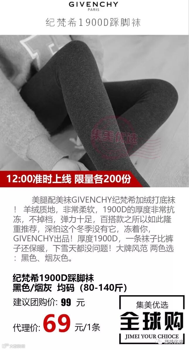 美腿配美袜GIVENCHY纪梵希加绒打底袜! 羊绒质地,非常柔软,1900D的厚度非常抗冻,不掉档,弹力十足,百搭款之所以如此隆重推荐,深怕这个冬季没有它,冻着你,GIVENCHY出品!厚度1900D,一条袜子比裤子还保暖,下雪天都没问题!大牌风范 两色选:黑色、烟灰色。