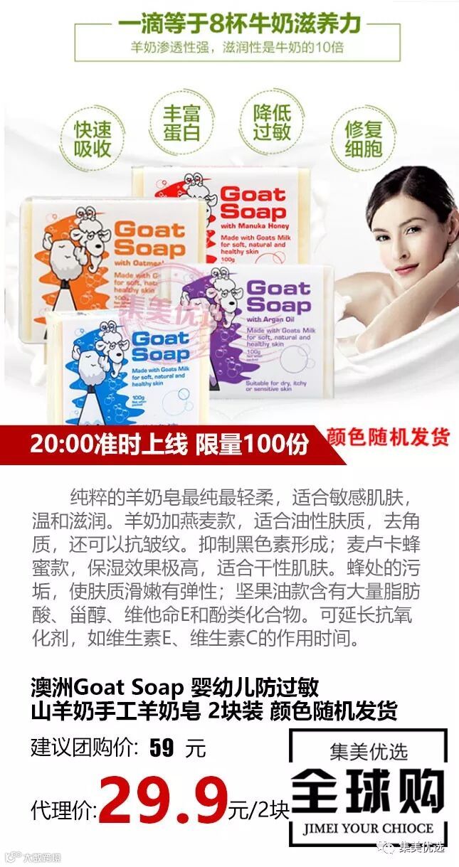 澳洲Goat Soap 婴幼儿防过敏山羊奶手工羊奶皂 2块装 颜色随机发货