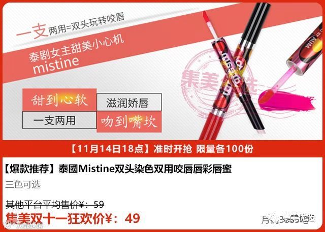 这款泰国超火的唇彩,拥有特有便捷的双节管装,将锁色唇膏及染唇液一并包容。特有锁色技术,长效持久,炫亮色彩,持久保留唇膏色泽,不易褪色,晕化,不起皮,即使饭后也不粘杯、齿。保湿成份,随时补充唇部所需水份,富含99%保湿成分,配合金菊,大豆精华提取物,能迅速渗透,滋润唇部肌肤,瞬时点亮柔软双唇!