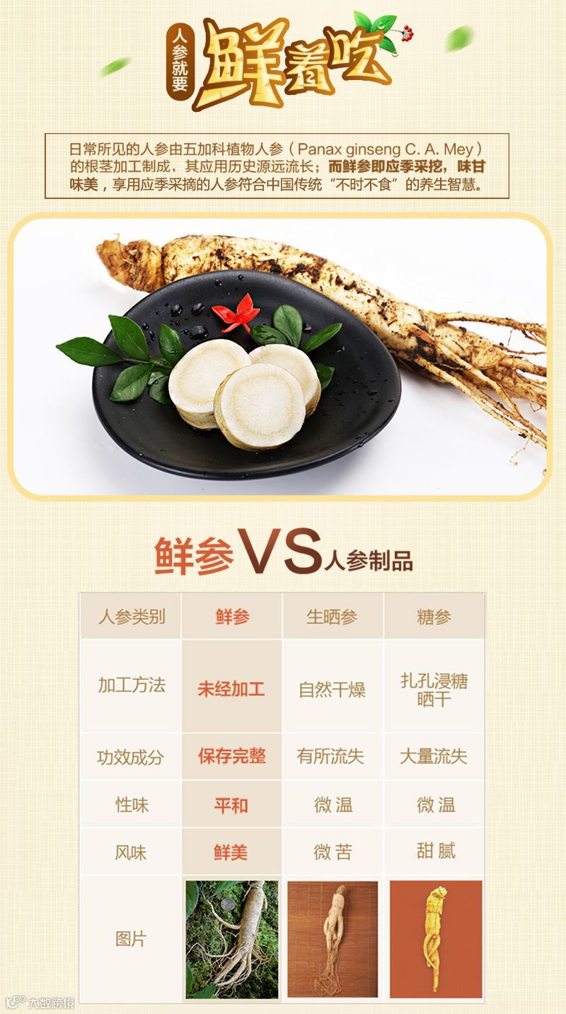 1、鲜人参,活性成分高。鲜参完整的保存了人参的天然精华(人参的活性成分),除滋补强身外,更具人参之甘香鲜美,实属养生佳品,人参皂苷含量高于干人参27%。