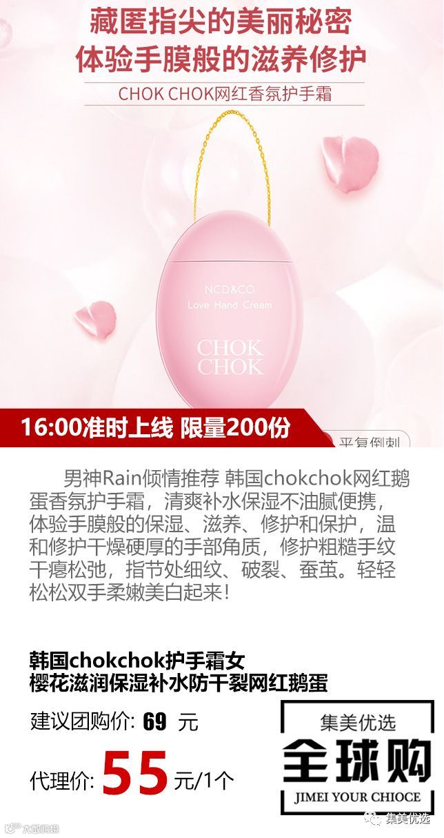 男神Rain倾情推荐 韩国chokchok网红鹅蛋香氛护手霜,清爽补水保湿不油腻便携,体验手膜般的保湿、滋养、修护和保护,温和修护干燥硬厚的手部角质,修护粗糙手纹干瘪松弛,指节处细纹、破裂、蚕茧。轻轻松松双手柔嫩美白起来!