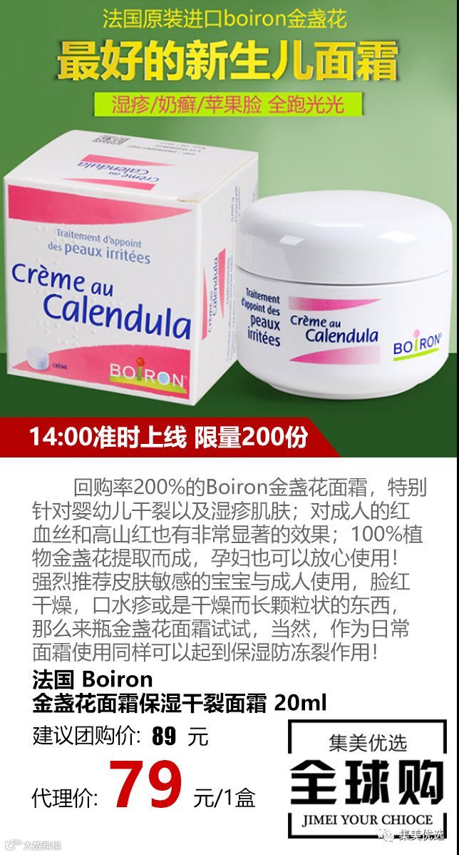 回购率200%的Boiron金盏花面霜20ml,特别针对婴幼儿干裂以及湿疹肌肤;对成人的红血丝和高山红也有非常显著的效果;100%植物金盏花提取而成,孕妇也可以放心使用!强烈推荐皮肤敏感的宝宝与成人使用,脸红干燥,口水疹或是干燥而长颗粒状的东西,那么来瓶金盏花面霜试试,当然,作为日常面霜使用同样可以起到保湿防冻裂作用!