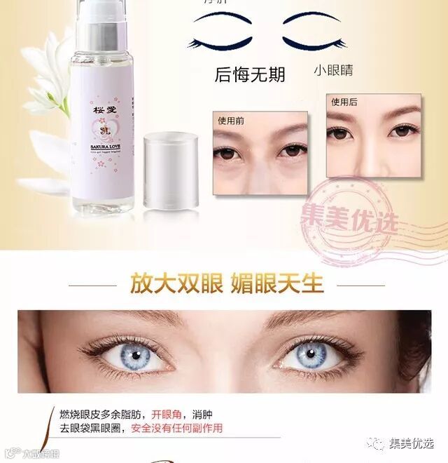 可以打造大眼睛效果,开眼角,去眼袋,黑眼圈,没有副作用!主要针对单眼皮、内双、眼部肌肤特别浮肿或者眼部皮下肉层特别厚的人群,主要就是帮助眼部肿胀肌肉缩减,燃烧眼皮多余脂肪,消除眼部浮肿,紧实眼周肌肤。