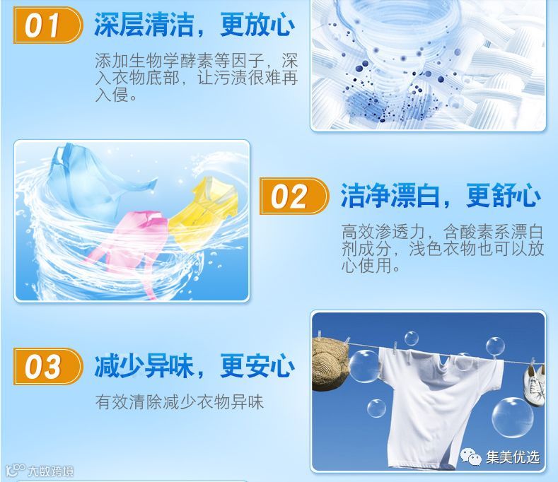 不仅去污渍能力强,而且还加入柔软剂成分,衣服洗后柔软洁白!无磷配方, 味道也清新、持久、好闻!